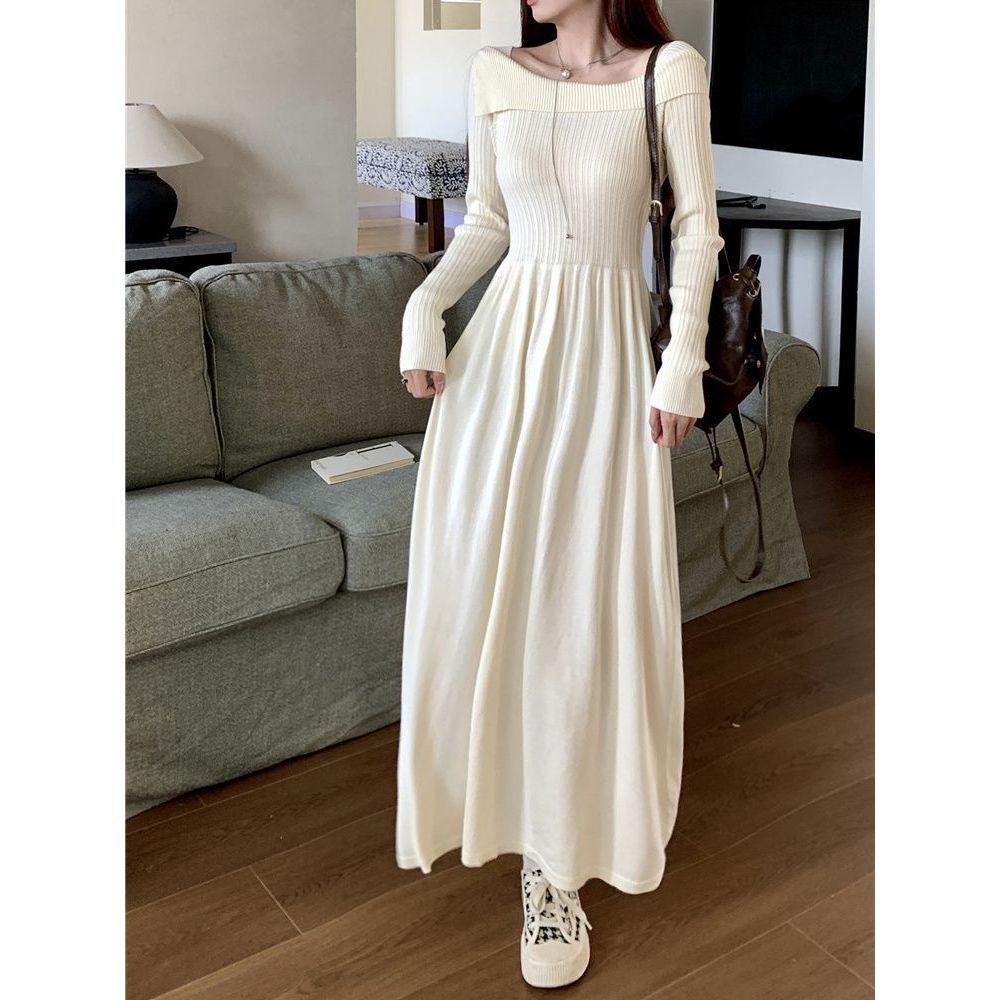 Damen Französisches Ein-Schulter Langarm Strickpulloverkleid, Schlankmachender Herbst/Winter Stil