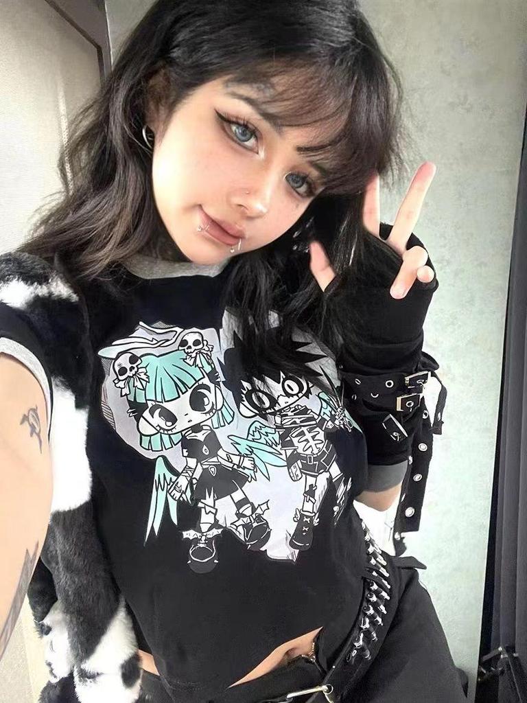 Damen Zweidimensional Süß und Cool Patchwork Kurzarm Streetwear Top - Sommer Trendiger Ins Style