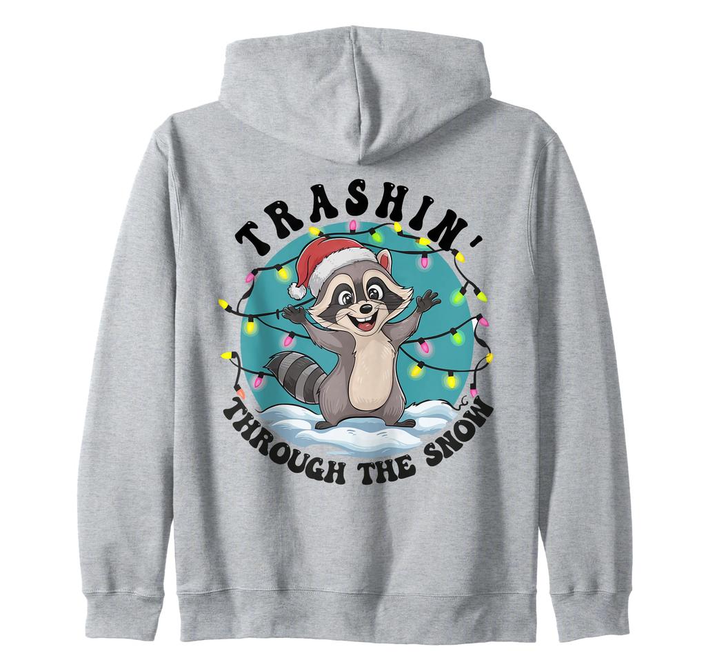 Mülleimer im Schnee Niedlicher Weihnachts-Waschbär Weihnachtsmannmütze Reißverschluss-Kapuzenpullover