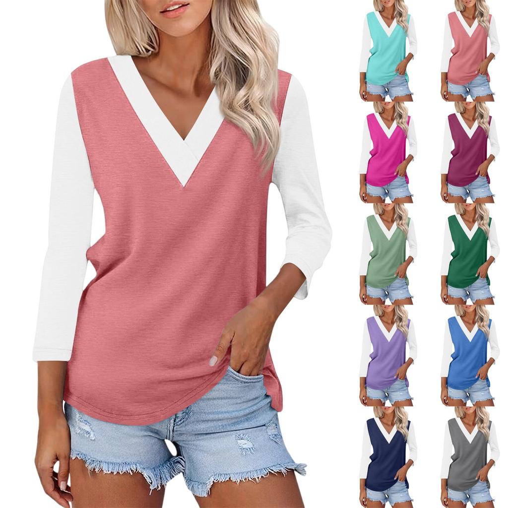 Damen Casual Mode Sexy Bequem V-Ausschnitt Farbblock Dreiviertelarm Top