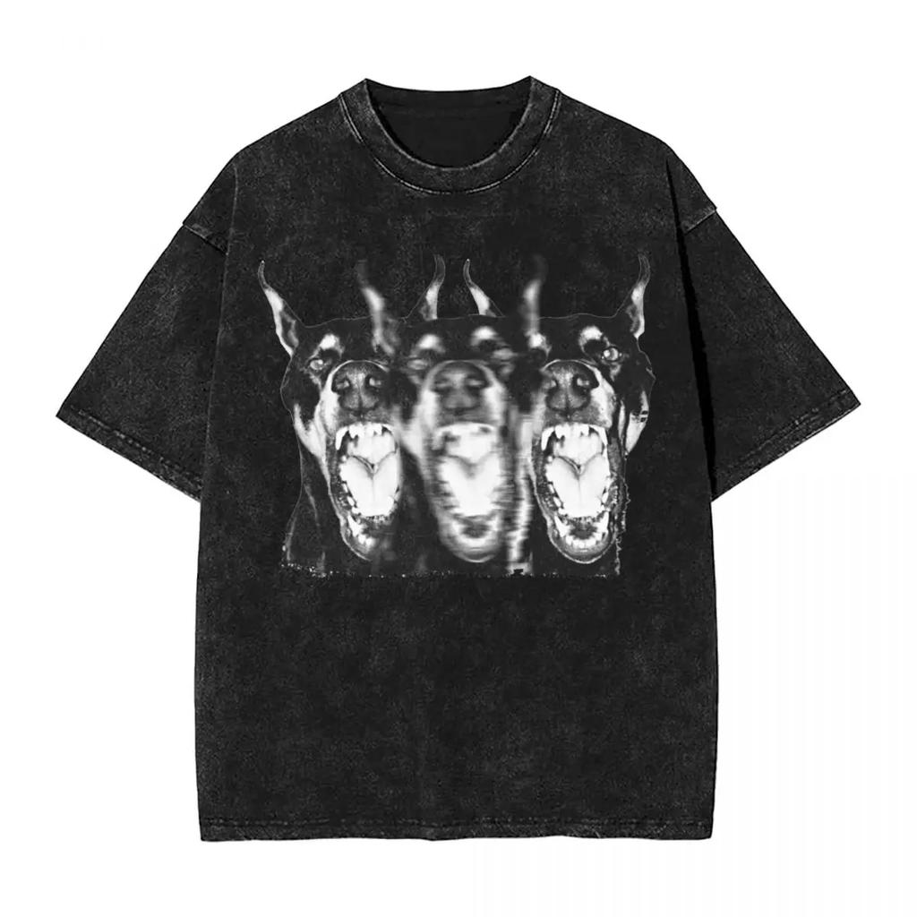 Lustiges Dobermann Hund Washed T-Shirt Streetwear Retro T-Shirts Tees Tops für Männer Frauen Kurzarm High Street Sommer