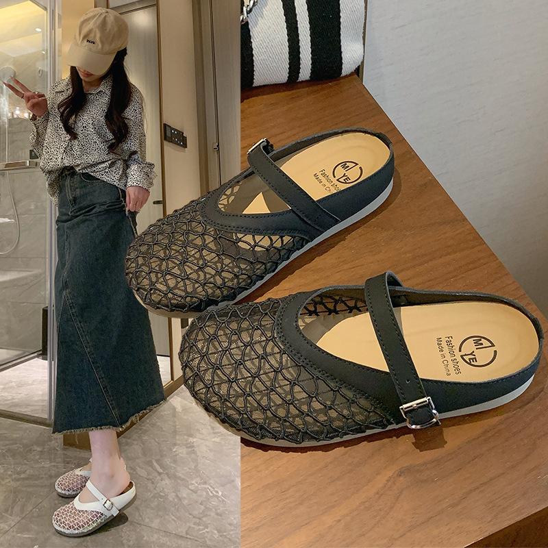 Französischer Beutelkopf mit flachem Boden, Halbschuhe, Damen-Außenschuhe, neue atmungsaktive und bequeme Sandalen mit weicher Sohle aus Mesh für Sommer 2025