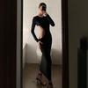 Sexy Elegantes Schwarzes Ausgeschnittenes Maxi-Kleid Damen Rundhalsausschnitt Hohe Taille Langarm Club Party Skinny Kleider