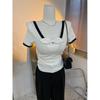 Low U-neck Large Collar Ribbed Cotton Short-sleeved T-shirt for Women's Summer New Color-contrast Reversible Tops