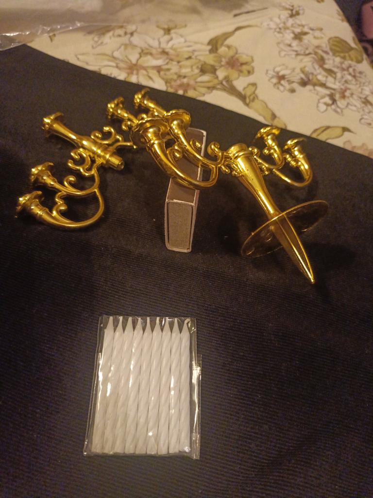 Schön, für den Kuchen, mit winzigen Kerzen. Dünner Kunststoff, vergoldet. Genau für 9 Jahre.