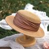 Strohhut mit flachem Oberteil für Damen, Satinband, große Krempe, Sonnenschutzhut, Strandsonnenhut, Sommerstrohflecht-Sonnenschirm, große Krempe, Zylinder
