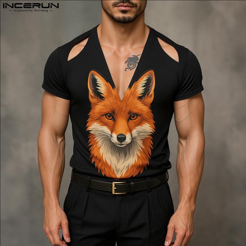 INCERUN Men Cutout V Neck Short Sleeves 3D Print Casual Fitted T-shirts Tops