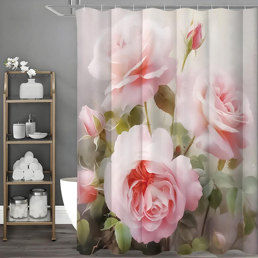 Rosa Rose Blumenduschvorhang, Dekorativer Duschvorhang für Badezimmer, Wasserdichter Duschvorhang mit Haken