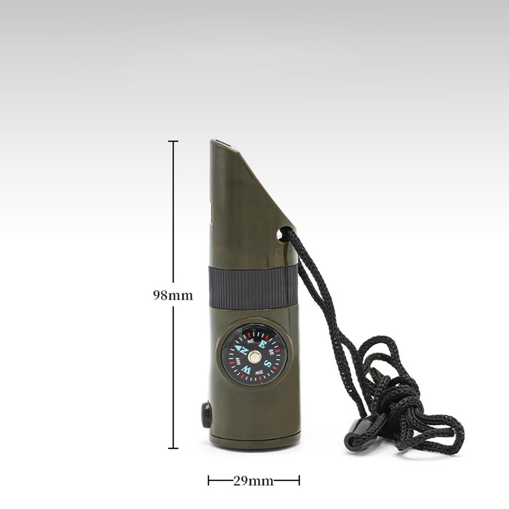 Unsere 7-in-1-Multifunktionspfeife ist ein Muss für Outdoor-Enthusiasten und bietet eine Reihe von Funktionen, darunter eine Überlebenspfeife, eine Lupe, LED-Licht, ein Thermometer und einen Kompass.