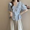 Female Lotus Leaf V-neck Plaid Shirt Light Blue Women's Short Sleeved Shirts Summer Fashion Versatile Pullover Blouses