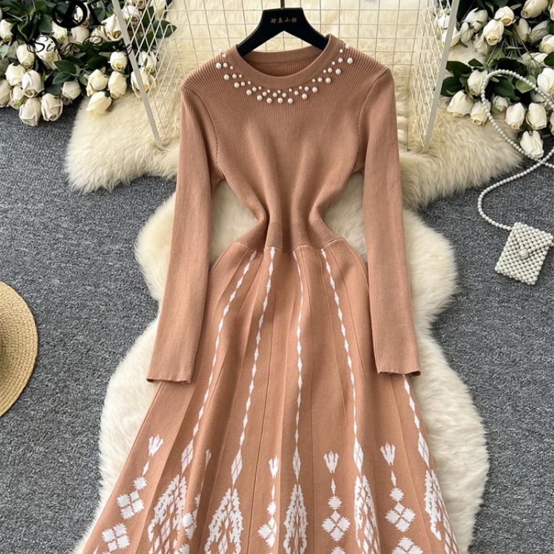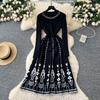 Mode Druck Strickwaren Pulloverkleid Damen Diamanten O-Ausschnitt Elastisches Slim Design 2025 Herbst Warm Französisch OL Lange Kleider