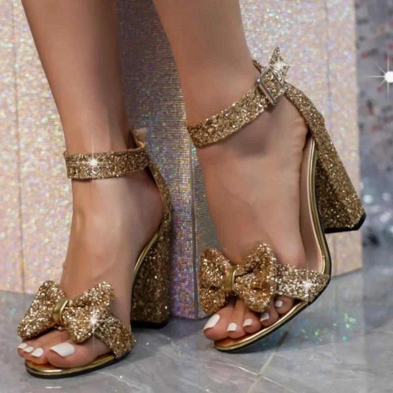 Damenmode Glänzende Kristall Schleife Pumps 2025 Sommer Neu Dicke Absätze Partyschuhe Frau Gold Pailletten Spitze Zehenpartie Pumps Sandalen