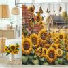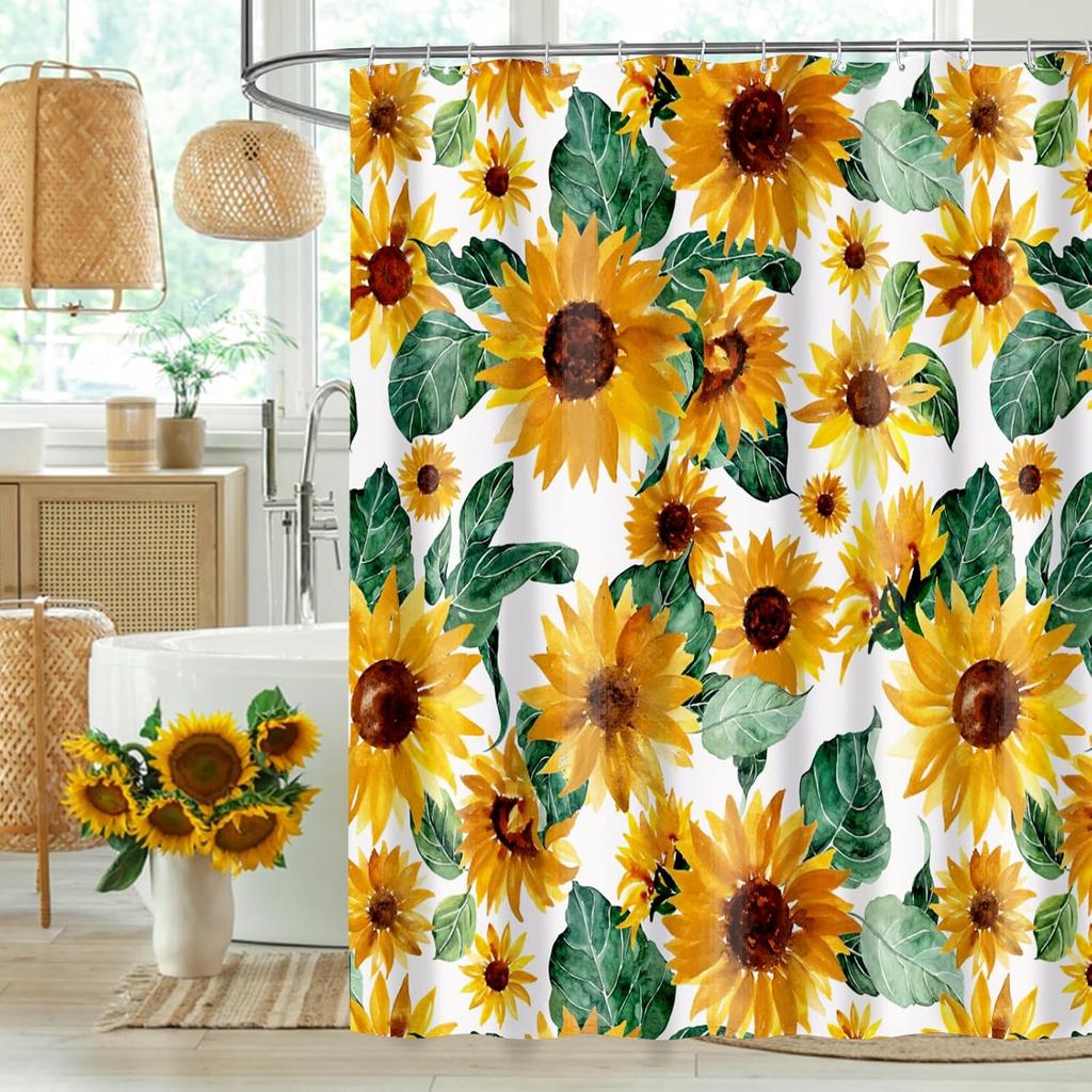 Sonnenblumen Duschvorhang - Aquarell Sonnenblume & Grüne Blätter Bauernhaus Badezimmerdeko, Rustikal Floral