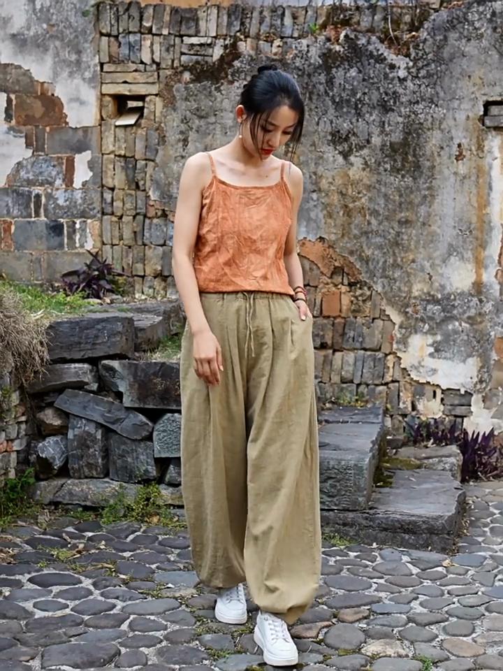 Johnature Damen Vintage Pumphose Hose Einfarbig Elastischer Bund Frühling Locker Taschen Gürtel Damen Lange Hose