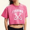 Angeln Fischhaken Print Damen Washed T-Shirt Mode Y2K Kurzarm Sommer Baumwolle Crop T-Shirt Top Retro T-Shirt