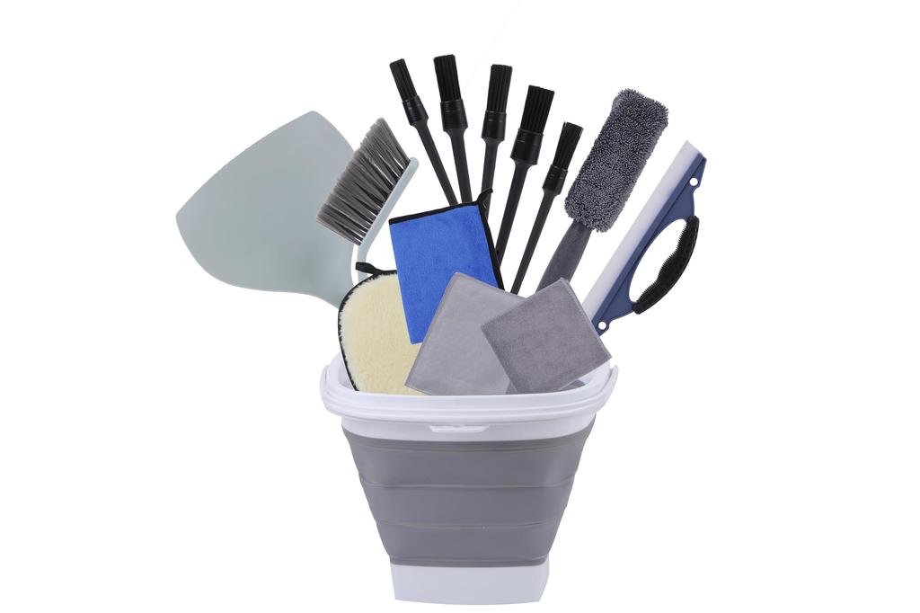 car wash kit including shearling absorbent microfiber and 14-piece sponge, brush, towel, bucket, motorcycle, gloves, broom, cloth, wheels. [Used]