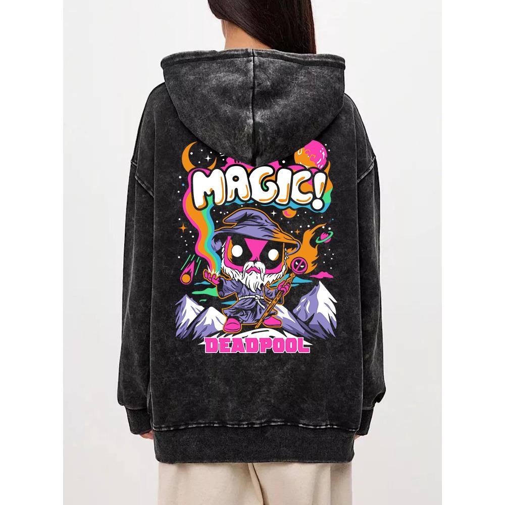Herbst Frau Acid Wash Hoodies Magie Deadpool Cartoons Druck Sweatshirt Retro Übergroße Baumwoll-Pullover Kleidung