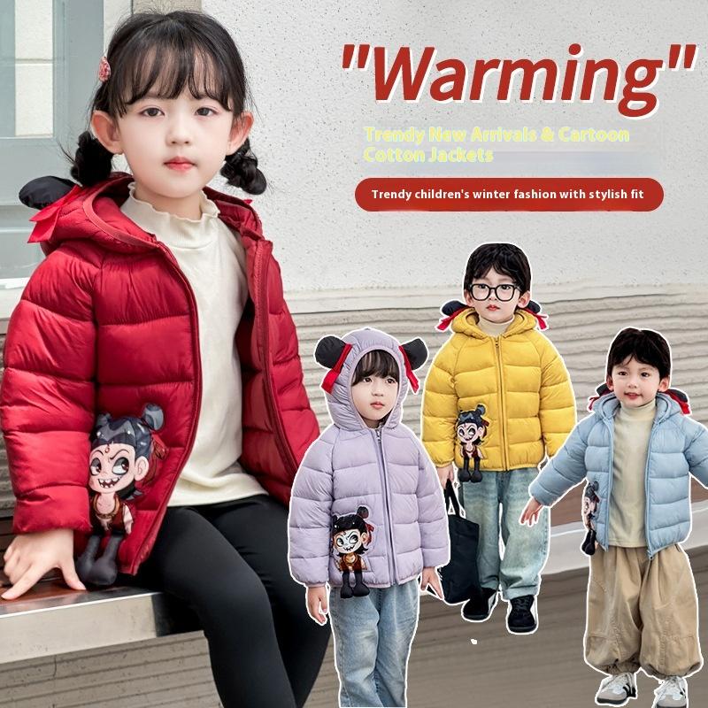 Kinder Nezha verdickte kurze Baumwolljacke Herbst und Winter Jungen niedliche Cartoon-Print Mäntel Mädchen warme Kapuzenjacken