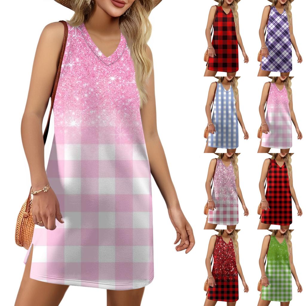 Women's V-neck Summer Casual Beach Vacation Women's Sleeveless Plaid Print Sundress
