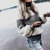 Damen-Pullover mit hoher Taille, lässig, Spleißen, langärmelig, Slim-Fit-Pullover