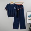 Neuer Sommer Einfacher Rundhals Patchwork Welpe Gestrickt Kurzärmelig Lässig Lange Hose Zweiteiler