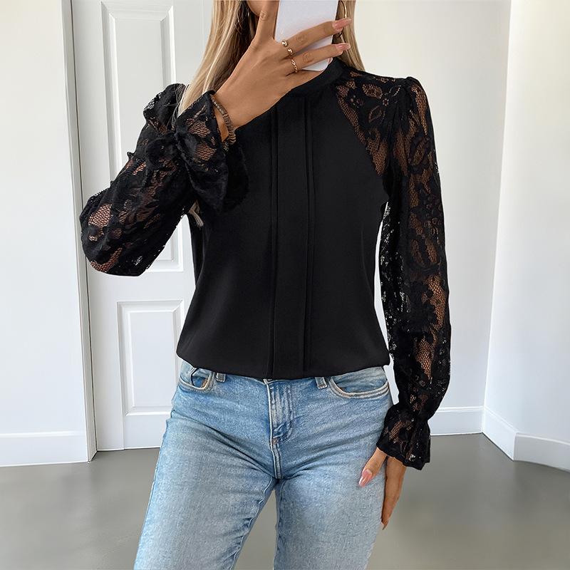 2025 New Autumn Versatile Sexy and Elegant Half Turtle Neck Solid Color Lace Long-sleeved Women's Shirt