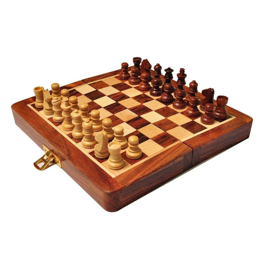 Sehr kleine Größe Holz Handgefertigt Faltbar Magnetisches Schachbrett Set mit Magnetischen Figuren und Zusätzlichen Damen für Kinder und Erwachsene (7.5x7.5 Zoll, Braun)