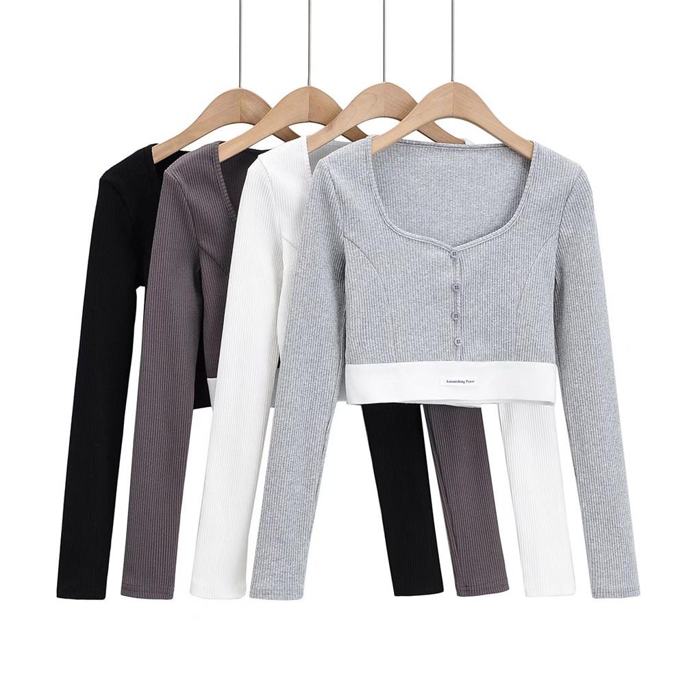 YPFF Trendiges Damen Cropped Slim Fit V-Ausschnitt Langarm Rippstrick Oberteil mit Logo-Applikation.