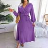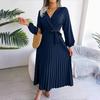Women Cross Solid Color V Neck Hem Pleated Long Dress For Fashion
