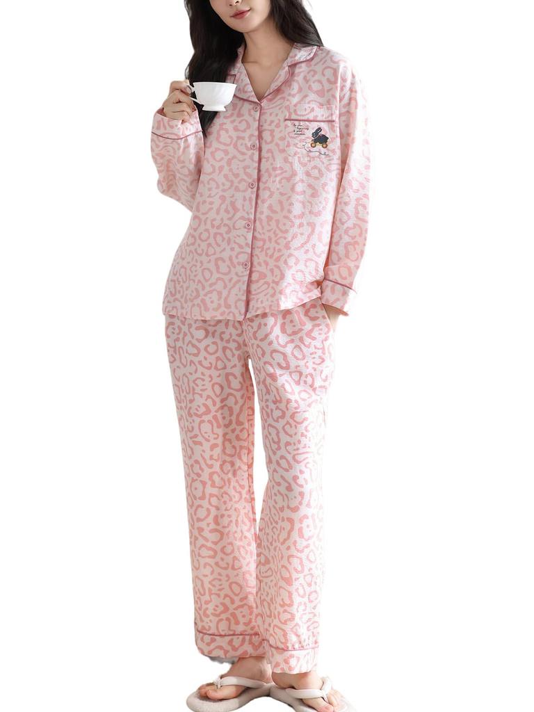 PHOLEEY Pajama Set with Long Loungewear for Spring and Cute Pattern Women's 2-Piece Bra, Polyester, Open-Front, Sleeves, Autumn,