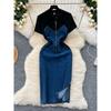 Internet Celebrity Niche Style Patchwork Denim Dress round Neck Short Sleeve