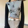 2KWEIRD Y2k Aesthetic Star Print T-shirt Long Sleeve Spring Basic Streetwear Cropped Top Slim Harajuku Contrast Color Casual Tee