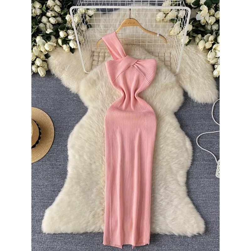 Fashion Fancy Knitting Diagonal Collar Dress Women's Summer Asymmetrical Accessible Luxury Slit Design Pure Desire Sexy Long Dress