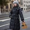Europäische Station neue Daunen-Baumwoll-Wattierung Damenbekleidung lang knielang Baumwoll-Wattierjacke Taille und dünn Winter verdickte Kapuzenjacke