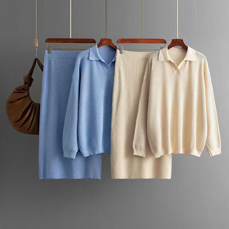 European and American Sexy Hollow Knitted Long sleeve Top Skirt sets Knitted Top and Skirt Set