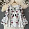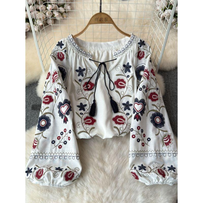 Retro Machine Embroidery Tops Women's 2024 Spring & Fall New V-neck Loose Slimming Lantern Sleeves Ethnic Style Shirt Fashion