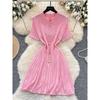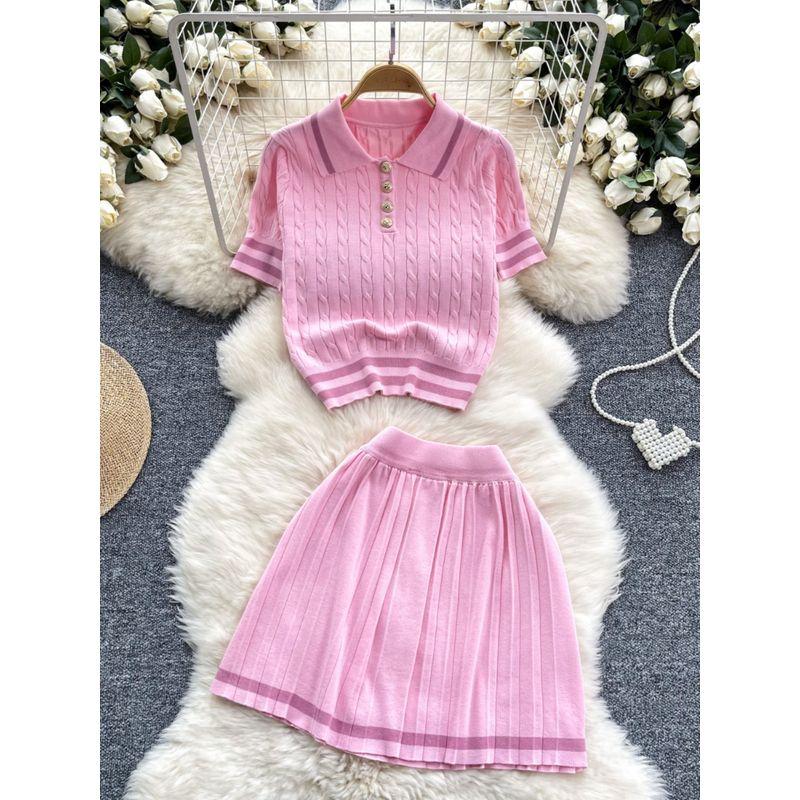 Summer New Arrival Easiest for Match Two-Piece Dress of Knitted Sweater Women's Retro Contrast Color Short Sleeve Tops + High Waist Pleated Skirt