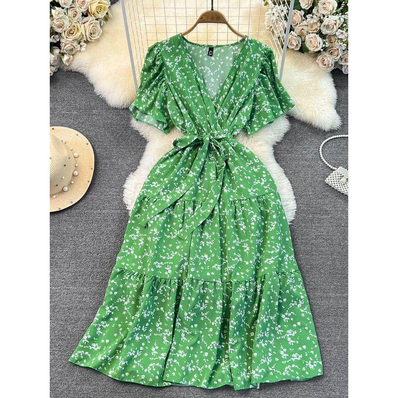 Chic South Korea Bubble V Neck A- line Dress Short Sleeve