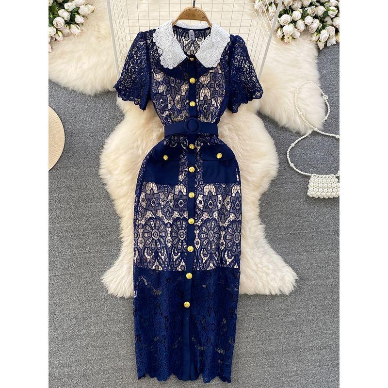 Doll Collar Cut Out Lace Dress Elegant Short Sleeve