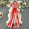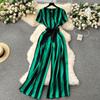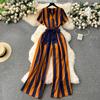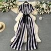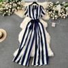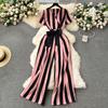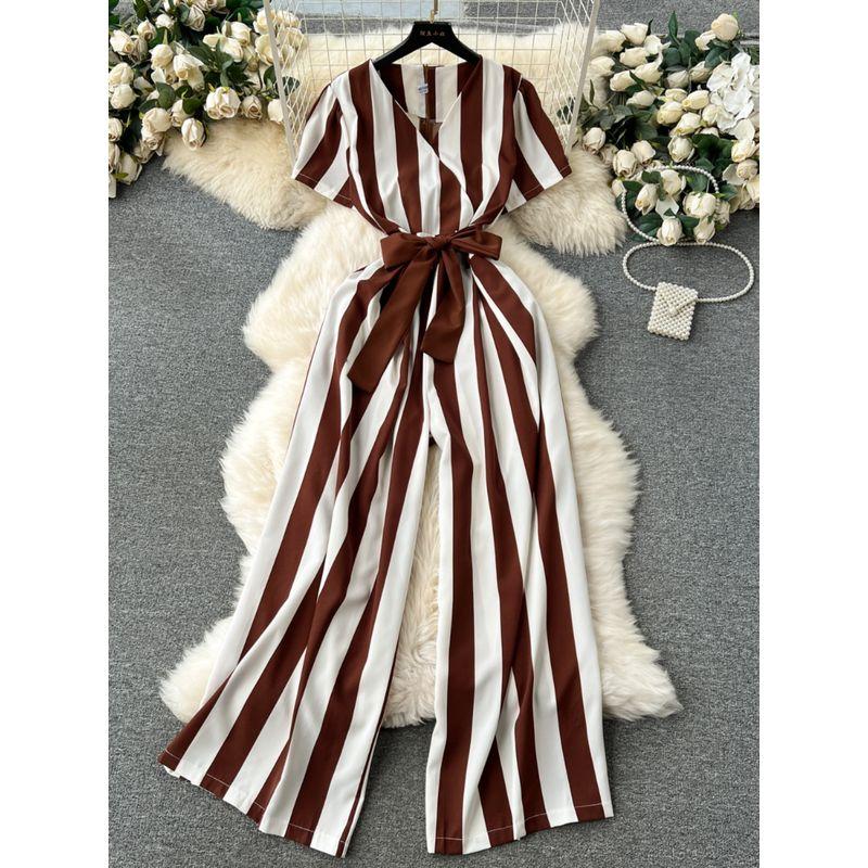 European and American Color Matching Striped Lace-up Waist-Tight Long Jumpsuit
