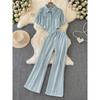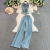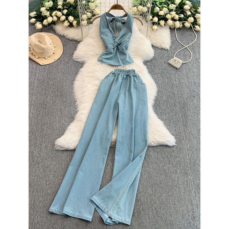 European and American Sexy V-neck Twist Waist Hugging Hanging Neck Denim Vest Top + High Waist Slimming Flared Wide Leg Trousers Set