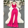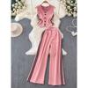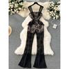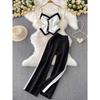 Pure Desire Style Sexy Lace Short Hanging Neck Sling + Contrast Color Stripe Gyaru High Waist Slimming Wide Leg Pants Two-piece Set