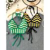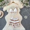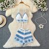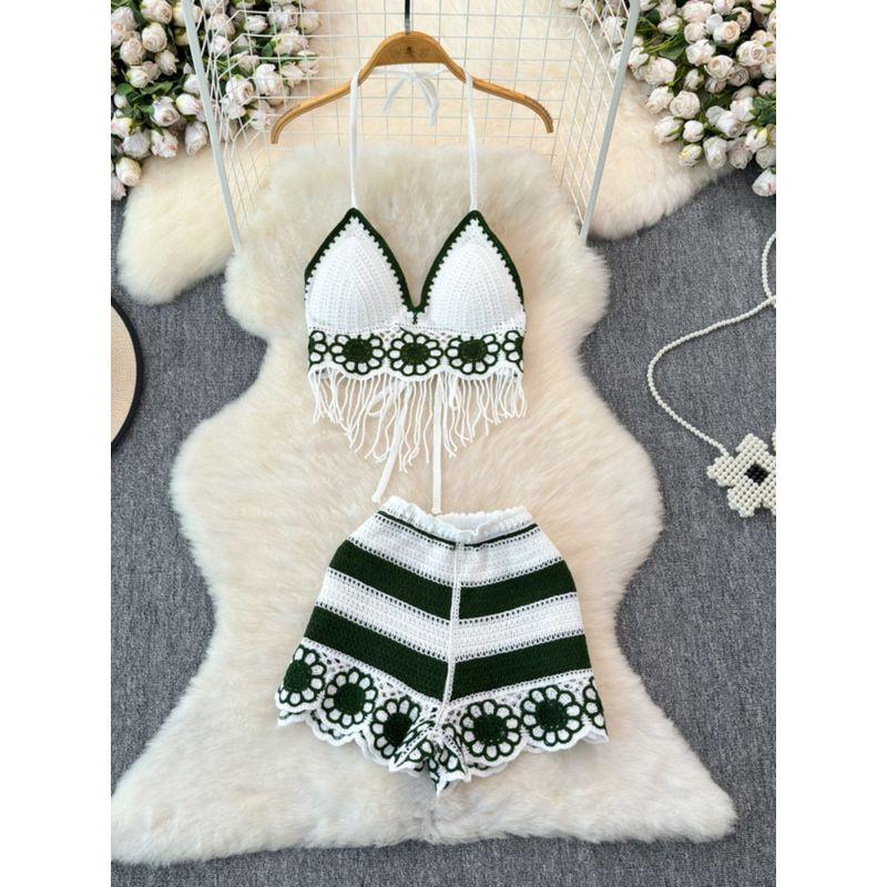 Vacation Style Beach Fashion Suit Halterneck Color-Block V Neck Tassel Vest Camisole + High Waist Hollow-out Wide Leg Shorts