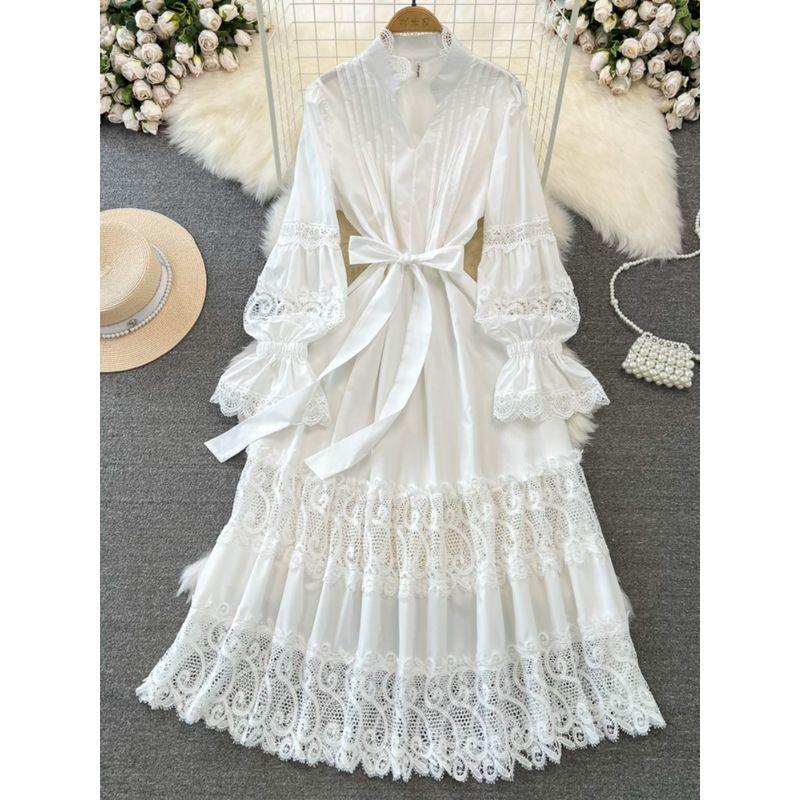 Fashion Socialite Temperament Long Sleeve V Neck Pleated Waist Tight Slim Looking A- line Cut Out Lace Dress Elegance Large Swing Dress
