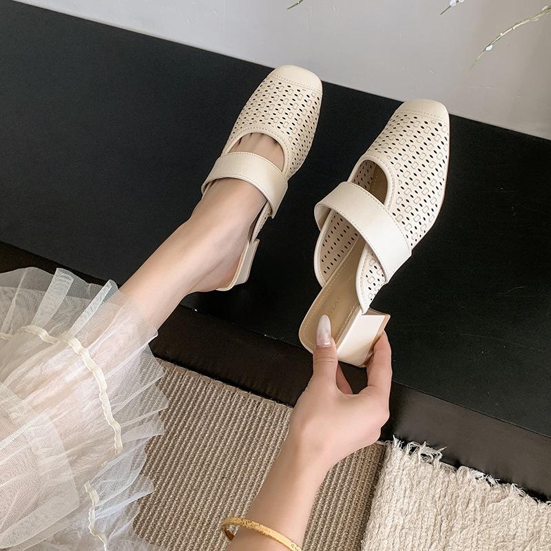 2025 summer French thick heel baotou explosion lazy drag new breathable hollow heel women's shoes