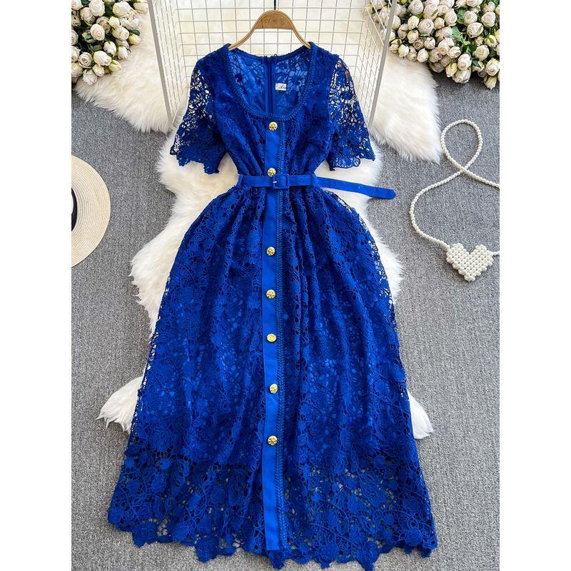 Single-Breasted Water Soluble Lace Dress Elegant Short Sleeve