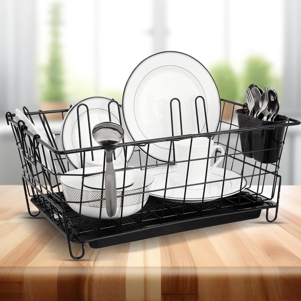 Luxuriöser Geschirrabtropfständer aus Stahl mit Abtropfschale | 3-teiliger Schneidebrett- & Glas-/Deckelhalter | Küchenkorb zum Trocknen von Utensilien | 55,3 cm x 37 cm x 23 cm | Schwarz