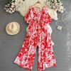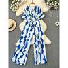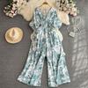 Gentle Bubble V-neck Casual High Waist Print Short Sleeve