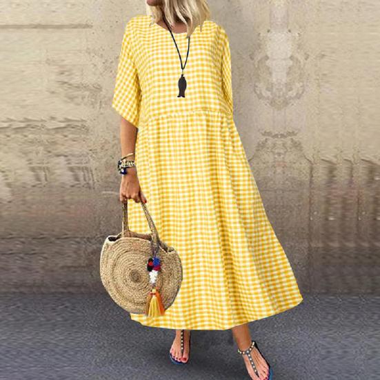Werten Sie Ihren Stil mit diesem Maxikleid mit Karomuster für Damen auf. Das lockere Taillendesign sorgt für eine bequeme Passform für die meisten Körpertypen. Dieses Kleid aus weichem Polyester verfügt über einen runden Ausschnitt und eine schmeichelhafte A-Linien-Silhouette.