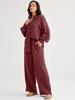 This stylish women's casual set features a loose long sleeve shirt paired with wide leg pants, perfect for a relaxed and comfortable look. The shirt has a button front and adjustable drawstring waist for a customizable fit, while the sleeves can be rolled up for a laid-back vibe. The wide leg pants offer a breezy and effortless style with natural wrinkle texture. The set comes in a warm beige shade, with other color options available including black, dark brown, olive green, and bright pink. Ideal for everyday wear, this outfit combines comfort and fashion effortlessly.